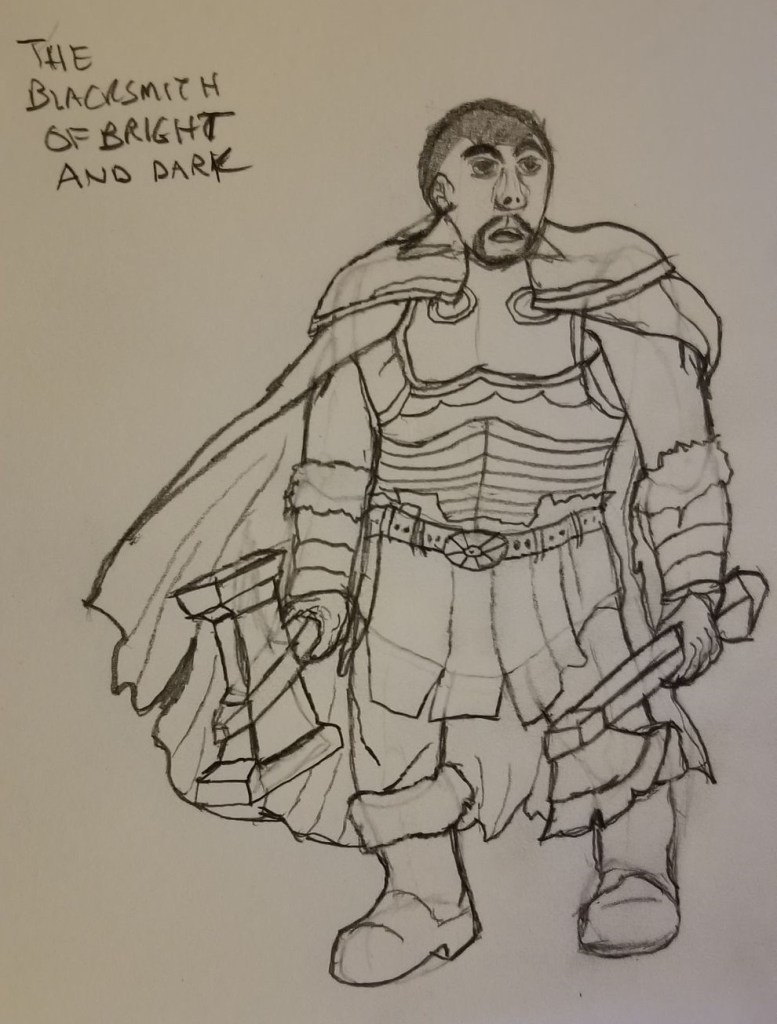 A similar story could be said for The Blacksmith of Bright and Dark, only in reverse. I knew I wanted to get into a quest about elemental weapons at some point and that quest eventually got upgraded to a mainline quest event. So with that, I knew had to draw a blacksmith for that quest, but with its increased importance, I wanted him to look as cool as I possibly could. That led to the design seen below.