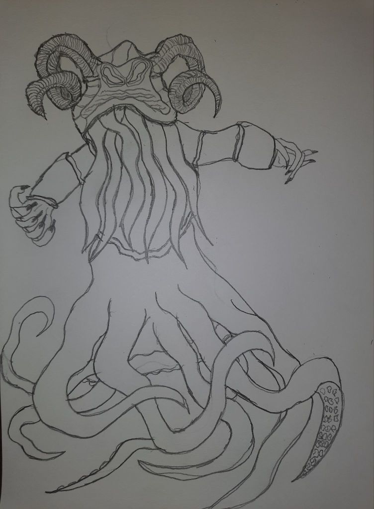 Essentially, this is Cthulhu meets Octodad if he worked at the grocery store. The first draft went the traditional route and monstrous, but once coloring came to play, Cthjim took a softer and more corporate touch.